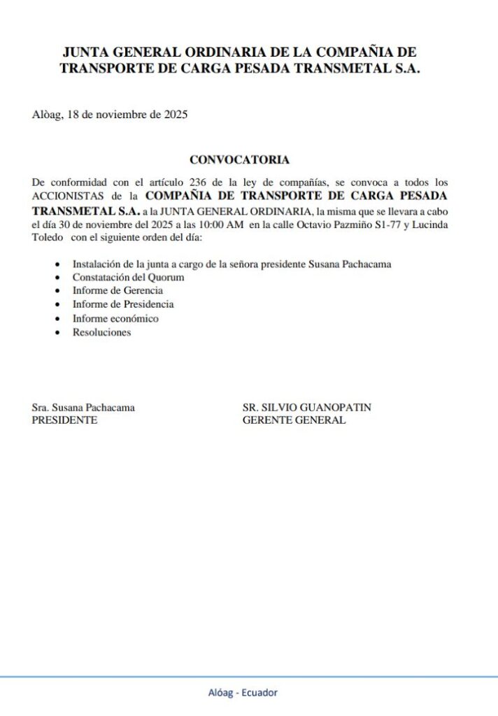 JudicialJudicial - Convocatorias CONVOCATORIA: Compañía de transporte de carga pesada TRANSMETAL S.A» Última actualización: 2025/11/19 at 2:53 PM Tierra Grande Publicado noviembre 19, 2025 Compartir COMPARTIR Noticias relacionadas Convocatoria: Compañía genética de los ANDES GENANDES S.A. Convocatoria: GRUAS Y REMOLQUES PILICITA -LEÓN S.S. CONVOCATORIA: COMPAÑIA DE TAXIS EL GIRASOL «COMPATAXY S.A» CONVOCATORIA CONVOCATORIA Tierra Grande noviembre 19, 2025 noviembre 19, 2025 Compartir este artículo Facebook Twitter Whatsapp Whatsapp LinkedIn Telegram Email Copy Link Print Deja un comentario Deja una respuesta Cancelar la respuestaTu dirección de correo electrónico no será publicada. Los campos obligatorios están marcados con *Comentario * Nombre * Correo electrónico * Web Guarda mi nombre, correo electrónico y web en este navegador para la próxima vez que comente. Redes sociales Facebook Like Twitter Follow Instagram Follow Youtube Subscribe Noticias populares Voz Ciudadana Plaza Polifuncional Tierra Grande septiembre 15, 2023 CONVOCATORIA «CARPES MEJÍA» COOPERATIVA DE AHORRO Y CRÉDITO “MANANTIAL DE ORO” LTDA Segunda Convocatoria Compañía de Taxis EL GIRASOL “COMPATAXSG S.A. ” Suscripción del convenio entre la Perfectura de Pichincha y el Centro Agrícola del Cantón Mejía - Publicidad -