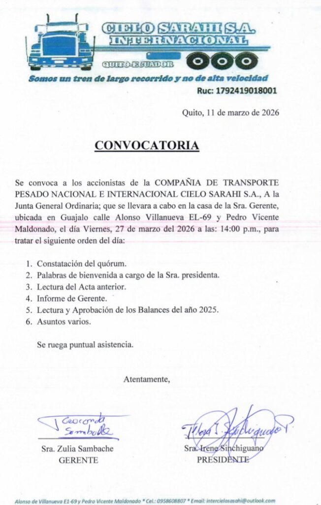 JudicialJudicial - Convocatorias Convocatoria: compañía de transporte pesado nacional e internacional «CIELO SARAHI S.A» Última actualización: 2026/03/18 at 7:53 PM Tierra Grande Publicado marzo 18, 2026 Compartir COMPARTIR Noticias relacionadas CONVOCATORIA: Innovaciónes hidráulicas Pilicita S.A.S CONVOCATORIA: COMPAÑIA TRANS VENEGAS TRAVEC S.A Compañia de transporte de carga pesada y extrapesada «STOCKTRANS S.A» Convocatoria: Compañía de transporte pesado e internacional «MARYTERE S.A» CONVOCATORIA: COMPAÑÍA DE CANCIONES SEBASTIÁN DE BENALCÁZAR S.A. Tierra Grande marzo 18, 2026 marzo 18, 2026 Compartir este artículo Facebook Twitter Whatsapp Whatsapp LinkedIn Telegram Email Copy Link Print Deja un comentario Deja una respuesta Cancelar la respuestaTu dirección de correo electrónico no será publicada. Los campos obligatorios están marcados con *Comentario * Nombre * Correo electrónico * Web Guarda mi nombre, correo electrónico y web en este navegador para la próxima vez que comente. Redes sociales Facebook Like Twitter Follow Instagram Follow Youtube Subscribe Noticias populares Publicidad Papelería «Cristina» Tierra Grande mayo 1, 2023 CONVOCATORIA CONVOCATORIA JUNTA GENERAL EXTRAORDINARIA DE ACCIONISTAS DE LA COMPAÑÍA DE TRANSPORTE EN TAXIS EL GIRASOL COMPATAXSG S.A. Pasaje José Mejía en condiciones deplorables OPCIÓN VIAL PARA INGRESAR A MACHACHI - Publicidad -