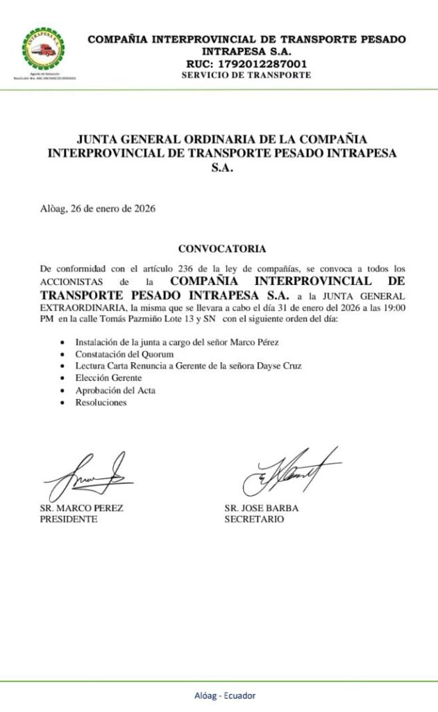JudicialJudicial - Convocatorias CONVOCATORIA: COMPAÑIA INTERPROVINCIAL DE TRASPORTE PESADO INTRAPESA S.A Última actualización: 2026/01/26 at 3:06 PM Tierra Grande Publicado enero 26, 2026 Compartir COMPARTIR Noticias relacionadas CONVOCATORIA: COMPAÑIA INTERPROVINCIAL DE TRASPORTE PESADO INTRAPESA S.A CONVOCATORIA: EL GIRASOL COMPATAXSG S.A COMPAÑÍA TRANSPORTADORA DE CARGA TRANSMEJÍA S.A. CONVOCATORIA: Compañía de transporte de carga pesada TRANSMETAL S.A» Convocatoria: Compañía genética de los ANDES GENANDES S.A. Tierra Grande enero 26, 2026 enero 26, 2026 Compartir este artículo Facebook Twitter Whatsapp Whatsapp LinkedIn Telegram Email Copy Link Print Deja un comentario Deja una respuesta Cancelar la respuestaTu dirección de correo electrónico no será publicada. Los campos obligatorios están marcados con *Comentario * Nombre * Correo electrónico * Web Guarda mi nombre, correo electrónico y web en este navegador para la próxima vez que comente. Redes sociales Facebook Like Twitter Follow Instagram Follow Youtube Subscribe Noticias populares COMPAÑÍA DE TRANSPORTE PESADO NACIONAL E INTERNACIONAL MARYTERE S.A. Tierra Grande marzo 21, 2024 JURAMENTO A LA BANDERA: «UNIDAD EDUCATIVA INTERNACIONAL BRITÁNICO LOS ANDES» CONVOCATORIA COMPAÑÍA DE TRANSPORTE PESADO TRANSIDNEY CIA LTDA. OPCIÓN VIAL PARA INGRESAR A MACHACHI CONVOCATORIA - Publicidad -