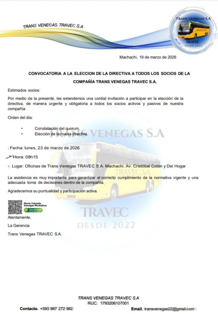 JudicialJudicial - Convocatorias CONVOCATORIA: COMPAÑIA TRANS VENEGAS TRAVEC S.A Última actualización: 2026/03/19 at 1:24 PM Tierra Grande Publicado marzo 19, 2026 Compartir COMPARTIR Noticias relacionadas CONVOCATORIA: Innovaciónes hidráulicas Pilicita S.A.S Convocatoria: compañía de transporte pesado nacional e internacional «CIELO SARAHI S.A» Compañia de transporte de carga pesada y extrapesada «STOCKTRANS S.A» Convocatoria: Compañía de transporte pesado e internacional «MARYTERE S.A» CONVOCATORIA: COMPAÑÍA DE CANCIONES SEBASTIÁN DE BENALCÁZAR S.A. Tierra Grande marzo 19, 2026 marzo 19, 2026 Compartir este artículo Facebook Twitter Whatsapp Whatsapp LinkedIn Telegram Email Copy Link Print Deja un comentario Deja una respuesta Cancelar la respuestaTu dirección de correo electrónico no será publicada. Los campos obligatorios están marcados con *Comentario * Nombre * Correo electrónico * Web Guarda mi nombre, correo electrónico y web en este navegador para la próxima vez que comente. Redes sociales Facebook Like Twitter Follow Instagram Follow Youtube Subscribe Noticias populares Compañía de Camiones Sebastián de Benalcázar “SEBENTRANS S.A.” Tierra Grande marzo 22, 2024 ¿Hasta cuándo sin arreglo? Vía Abandonada OPCIÓN VIAL PARA INGRESAR A MACHACHI La cantaleta de «honrar la deuda» - Publicidad -