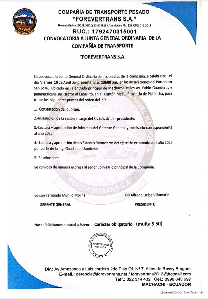 CONVOCATORIA COMPAÑIA DE TRANSPORTE PESADO «FOREVERTRANS S.A.»