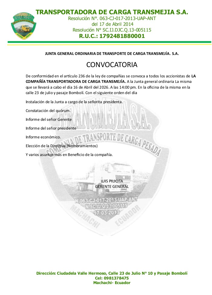 Judicial - Convocatorias Convocatoria TRANSMEJIA S.A. Última actualización: 2026/04/08 at 4:41 PM Tierra Grande Publicado abril 8, 2026 Compartir COMPARTIR Noticias relacionadas CONVOCATORIA COMPAÑIA DE TRANSPORTE PESADO «FOREVERTRANS S.A.» CONVOCATORIA: COMPAÑIA DE TRANSPORTE PESADO NACIONAL E INTERNACIONAL MARYTERE S.A CONVOCATORIA: GRÙAS Y REMOLQUES PILICITA -LEÓN S.A CONVOCATORIA COMPANIA GASTRANCARGA S.A CONVOCATORIA: Compañía de Transporte de Carga Pesada Caiza Ch. Tierra Grande abril 8, 2026 abril 8, 2026 Compartir este artículo Facebook Twitter Whatsapp Whatsapp LinkedIn Telegram Email Copy Link Print Deja un comentario Deja una respuesta Cancelar la respuestaTu dirección de correo electrónico no será publicada. Los campos obligatorios están marcados con *Comentario * Nombre * Correo electrónico * Web Guarda mi nombre, correo electrónico y web en este navegador para la próxima vez que comente. Redes sociales Facebook Like Twitter Follow Instagram Follow Youtube Subscribe Noticias populares CONVOCATORIA Tierra Grande julio 21, 2025 Convocatoria: Compañía de transporte pesado e internacional «MARYTERE S.A» II Desfile Nacional de Carretas y Carruajes en Machachi Celebra los 203 Años de Independencia CONVOCATORIA COMPAÑÍA TRANSPORTADORA DE CARGA TRANSMEJÍA S.A. - Publicidad -