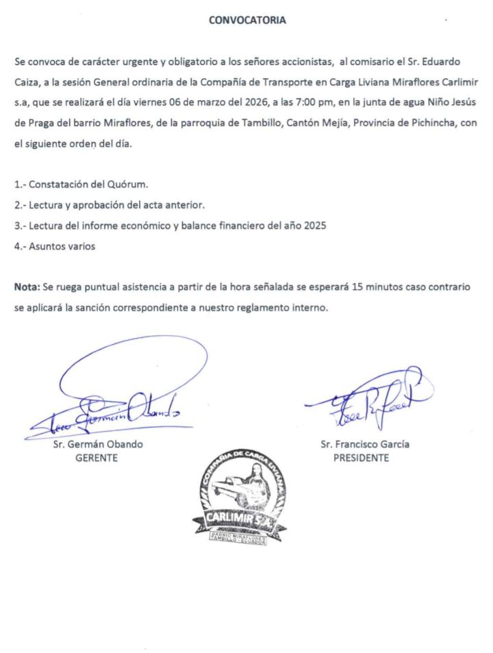 JudicialJudicial - Convocatorias Convocatoria Última actualización: 2026/02/27 at 10:32 PM Tierra Grande Publicado febrero 27, 2026 Compartir COMPARTIR Noticias relacionadas CONVOCATORIA: COMPAÑÍA DE CANCIONES SEBASTIÁN DE BENALCÁZAR S.A. CONVOCATORIA: EL GIRASOL «COMPATAXSG S.A» CONVOCATORIA: COMPAÑIA DE CARGA PESADA «CARPES MEJIA» CONVOCATORIA: COMPAÑIA INTERPROVINCIAL DE TRASPORTE PESADO INTRAPESA S.A CONVOCATORIA: EL GIRASOL COMPATAXSG S.A Tierra Grande febrero 27, 2026 febrero 27, 2026 Compartir este artículo Facebook Twitter Whatsapp Whatsapp LinkedIn Telegram Email Copy Link Print Deja un comentario Deja una respuesta Cancelar la respuestaTu dirección de correo electrónico no será publicada. Los campos obligatorios están marcados con *Comentario * Nombre * Correo electrónico * Web Guarda mi nombre, correo electrónico y web en este navegador para la próxima vez que comente. Redes sociales Facebook Like Twitter Follow Instagram Follow Youtube Subscribe Noticias populares Invitación Religiosa Tierra Grande abril 24, 2024 CONVOCATORIA COMPAÑÍA DE TRANSPORTE DE CARGA VILLACIS S.A. ¡Juntos construiremos MEJÍA para los mejisenses! Razones detrás de la salida de la Dirección Distrital de Educación 17D11 Mejía-Rumiñahui en Aloasí CONVOCATORIA - Publicidad -
