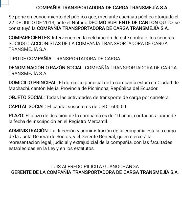 Sin categoría COMPAÑÍA TRANSPORTADORA DE CARGA TRANSMEJIA S.A Última actualización: 2025/12/17 at 10:55 AM Tierra Grande Publicado diciembre 17, 2025 Compartir COMPARTIR Noticias relacionadas CONVOCATORIA TRANSPORTES HILVARTRANS S.A CONVOCATORIA: COMPAÑIA GENÉRICOS Y VETERINARIOS DEL ECUADOR GENVET S.A JURAMENTO A LA BANDERA: «UNIDAD EDUCATIVA INTERNACIONAL BRITÁNICO LOS ANDES» Convocatoria: GRUAS Y REMOLQUES PILICITA -LEÓN S.S. CONVOCATORIA: COMPAÑIA DE TAXIS EL GIRASOL «COMPATAXY S.A» Tierra Grande diciembre 17, 2025 diciembre 17, 2025 Compartir este artículo Facebook Twitter Whatsapp Whatsapp LinkedIn Telegram Email Copy Link Print Deja un comentario Deja una respuesta Cancelar la respuestaTu dirección de correo electrónico no será publicada. Los campos obligatorios están marcados con *Comentario * Nombre * Correo electrónico * Web Guarda mi nombre, correo electrónico y web en este navegador para la próxima vez que comente. Redes sociales Facebook Like Twitter Follow Instagram Follow Youtube Subscribe Noticias populares CONVOCATORIA: COMPAÑIA GENÉRICOS Y VETERINARIOS DEL ECUADOR GENVET S.A Tierra Grande enero 9, 2026 CONVOCATORIA CONVOCATORIA JUNTA GENERAL EXTRAORDINARIA DE ACCIONISTAS DE LA COMPAÑÍA DE TRANSPORTE EN TAXIS EL GIRASOL COMPATAXSG S.A. CONSMEDIX Convocatoria a la asamblea general de elecciones del Club Deportivo Básico Parroquial «Marañon L. Tambillo» - Publicidad -