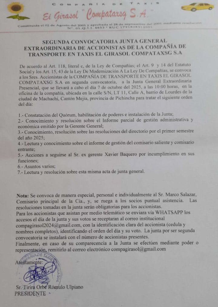 Sin categoría CONVOCATORIA: COMPAÑIA DE TAXIS EL GIRASOL «COMPATAXY S.A» Última actualización: 2025/09/23 at 10:15 PM Tierra Grande Publicado septiembre 23, 2025 Compartir COMPARTIR Noticias relacionadas JURAMENTO A LA BANDERA: «UNIDAD EDUCATIVA INTERNACIONAL BRITÁNICO LOS ANDES» Convocatoria: GRUAS Y REMOLQUES PILICITA -LEÓN S.S. CONVOCATORIA: COMPAÑIA DE TAXIS EL GIRASOL «COMPATAXY S.A» CONVOCATORIA COMPAÑÍA DE TRANSPORTE PESADO TRANSIDNEY CIA LTDA. CONVOCATORIA COMPAÑÍA DE TRANSPORTE PESADO TRANSIDNEY CIA LTDA. Tierra Grande septiembre 23, 2025 septiembre 23, 2025 Compartir este artículo Facebook Twitter Whatsapp Whatsapp LinkedIn Telegram Email Copy Link Print Deja un comentario Deja una respuesta Cancelar la respuestaTu dirección de correo electrónico no será publicada. Los campos obligatorios están marcados con *Comentario * Nombre * Correo electrónico * Web Guarda mi nombre, correo electrónico y web en este navegador para la próxima vez que comente. Redes sociales Facebook Like Twitter Follow Instagram Follow Youtube Subscribe Noticias populares Convocatoria Compañía de Transporte Pesado Nacional e Interacional MARYTERE S.A Tierra Grande febrero 19, 2025 CONVOCATORIA Recuperar lo nuestro para beneficio de todos Convocatoria Compañía de Taxis EL GIRASOL “COMPATAXSG S.A. ” UNIDAD EDUCATIVA INTERNACIONAL BRITÁNICO LOS ANDES - Publicidad -